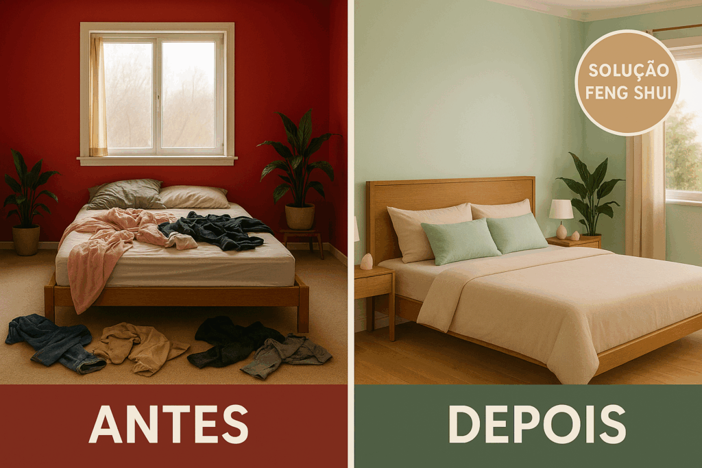 • Solução Feng Shui: Uma consultoria revelou que a cama de Ana e Tiago estava encostada na janela, o que simbolizava a “fuga” da energia e vulnerabilidade na intimidade. Além disso, havia uma pilha de revistas antigas e papéis de trabalho acumulados em um canto do quarto. A consultora orientou-os a: