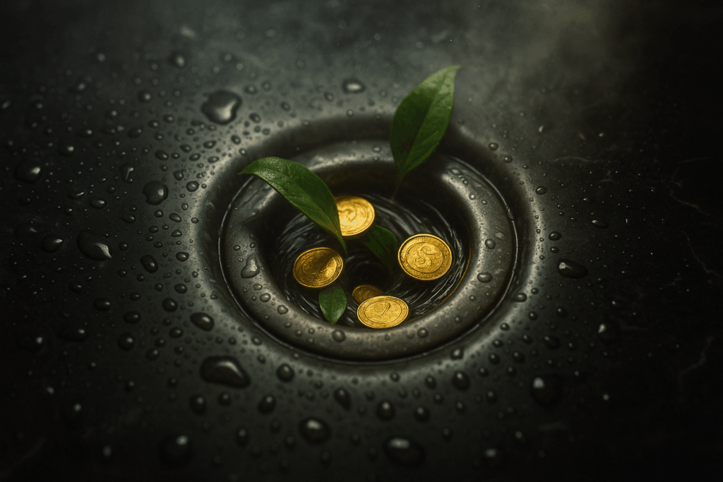 Na tradição chinesa, água = prosperidade. Mas no banheiro, ela literalmente escorre. Isso cria uma dualidade: